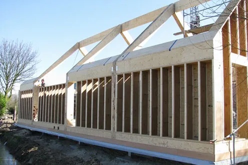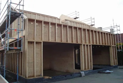 Монтаж каркасного дома из двутавровых балок. Деревянные двутавровые балки перекрытий, наружные стеновые стойки, внутренние перегородки, стропильная система, кронштейны.