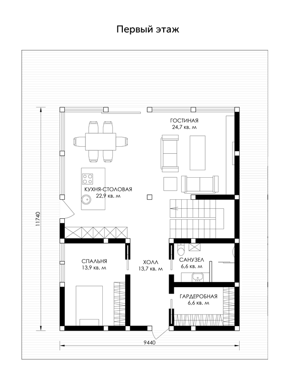 Представляем Вам самый просторный проект из коллекции Фахверк. Сразу приковывает взгляд фасад с панорамным остеклением. Благодаря этому решению все помещения дома всегда наполнены дневным светом и дом буквально сияет изнутри. Помимо чарующего внешнего вида, этот дом порадует вас рациональной планировкой. На первом этаже находятся гостиная, кухня-столовая, спальня или кабинет, сауна и хозяйственные помещения, а на втором расположились четыре спальни и два симметричных широких балкона для вашего отдыха тихими летними вечерами.
